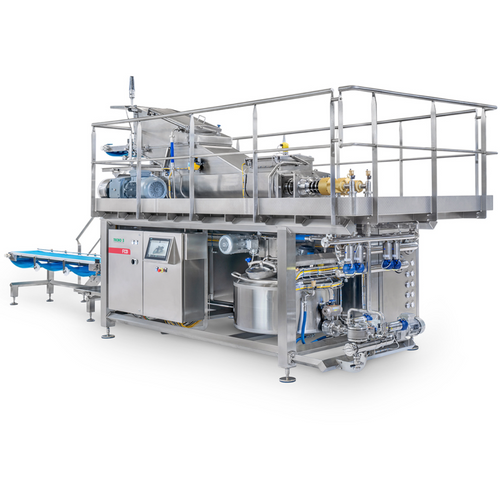 The innovative design of the FCD series continuous melter allows blocks of cocoa and chocolate mass, blocks of fat, anhydrous butter and hydrated fat (vegetable fat, dairy butter, etc.) to be processed in a single plant and is intended for the confectionery, dairy and food industries.It is equipped with a special innovative system that guarantees high productivity, reduced energy costs and a saving in labour. The thermal exchange is highly efficient thanks to the mechanical work performed by hot rotors, which carry out a scraping action on the surface of the blocks.The blocks to be processed are positioned on the cadence belt by the operator either manually or with automatic devices and are continuously conveyed to the feed unit of the loading mouth and conveyed to the heated and thinly spiralled removal and melting rotors. It acts as a scraper and constantly creates a new area to melt in contact with the hot part.The melting chamber is equipped with an innovative radar device, which constantly measures and manages the level of liquid product inside of the melting room: it allows the complete melting of the solid residues after being passed under the rotors.The same device also controls the outflow of the product, which, via the outlet located at the lowest part of the chamber, is continuously drawn in and sent to the production processes downstream.The new FCD Melter can be equipped with automatic devices to completely empty the melting tank and the flow pipes, if you need to change the product.The melting cycle is considerably reduced without a need for excessively high temperatures, which allows a preservation of the properties of the raw material.